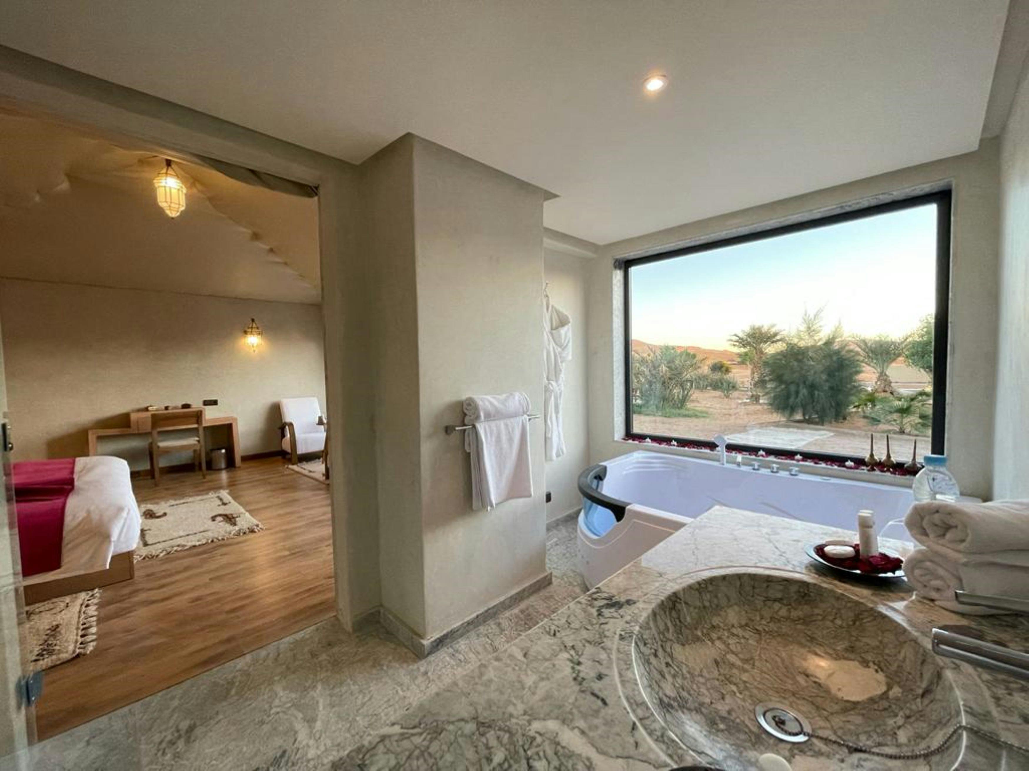 Royal Suite “Rissani” – Luxury Desert Suite in Merzouga | Private Jacuzzi & Premium Comfort : Experience one of the finest luxury suites in the Moroccan desert.The Royal Suite “Rissani” at Yakout Merzouga Luxury Camp offers an exceptional stay in the heart of the Erg Chebbi dunes, blending modern elegance, Berber craftsmanship, and absolute comfort.