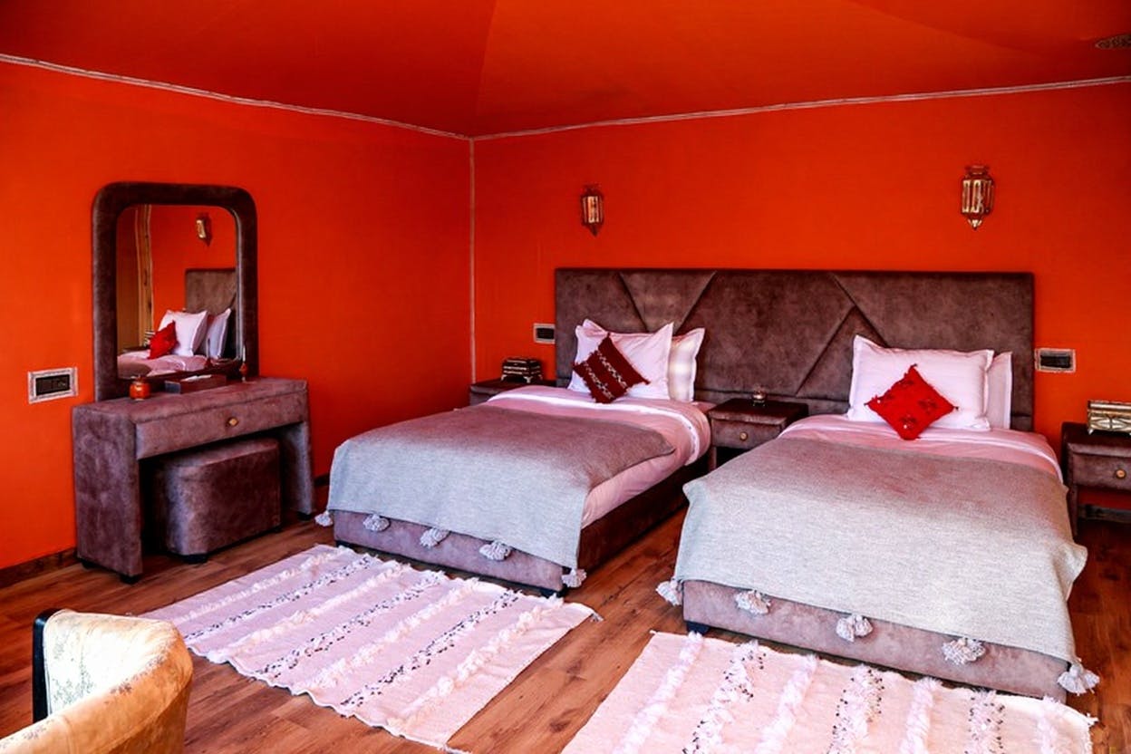 Royal Suite with Queen Bed - MERZANE For your premium Morocco desert stay, the Royale Suite Merzane with Erg Chebbi dunes view offers a majestic bedroom with a sumptuous king-size bed, a private lounge area for relaxation, and an elegant en-suite bathroom. Thoughtfully designed with authentic Berber accents and premium amenities, the Royal Suite ensures an unforgettable stay. Wake up to breathtaking, panoramic views of the golden Erg Chebbi dunes right from your doorstep, blending unparalleled comfort with the raw beauty of the Sahara.It features a hot tub and a pool with a view, offering a truly unique experience.Fully air-conditioned, it includes a private bathroom with a bathtub and bidet. The suite is also equipped with a minibar, tea and coffee maker, soundproof walls, and a terrace overlooking the garden.Royal Suite with King-Size Bed & Spa Bath - RISSANI Royal Suite “Rissani” – Luxury Desert Suite in Merzouga | Private Jacuzzi & Premium Comfort : Experience one of the finest luxury suites in the Moroccan desert.The Royal Suite “Rissani” at Yakout Merzouga Luxury Camp offers an exceptional stay in the heart of the Erg Chebbi dunes, blending modern elegance, Berber craftsmanship, and absolute comfort.Designed for discerning travelers, this spacious suite features a high-comfort King Size bed, a private jacuzzi, and a premium bathroom equipped with a bidet, soft atmospheric lighting, and refined finishes.The living area includes a cozy lounge corner with two armchairs and a stylish table—perfect for relaxing or enjoying traditional Moroccan tea. A refined work desk is also available for guests who need a calm and inspiring environment.The interior design harmoniously combines natural materials, Berber touches, and contemporary lines, creating a warm, authentic, and luxurious atmosphere. Ideal for couples, families, and honeymoon stays in Merzouga.Royal Suite with Spa Bath - BOUYA This suite features a hot tub and a pool with a view, offering guests a truly unique experience.Fully air-conditioned, it includes a private entrance, a comfortable living area, a separate bedroom, and a bathroom with a bathtub and bidet.The suite is also equipped with a minibar, tea and coffee maker, soundproof walls, and a patio with beautiful garden views.Royal Suite with Spa Bath - TAFILALET This suite features a hot tub and a pool with a view, offering a truly unique experience.Fully air-conditioned, it includes a private entrance, a living room, a separate bedroom, and a bathroom with a bathtub and bidet.The suite is also equipped with a minibar, tea and coffee maker, soundproof walls, and a terrace overlooking the garden.Royal Superior Suite - YAKOUT This suite offers a truly unique experience with its hot tub and pool with a view.Fully air-conditioned, it includes a private entrance, a comfortable living room, a separate bedroom, and a bathroom with a bathtub and bidet. The suite also features a minibar, tea and coffee maker, soundproof walls, and a terrace overlooking the garden — the perfect setting to relax and enjoy the tranquility of the desert.Royal Family Suite - SUNRISE Sunrise Royale Family Suite : A Magical Sunrise Awaits from Your Private Terrace .Overlooking the golden dunes of Merzouga, the Sunrise Royal Family Suite is the signature accommodation of Yakout Merzouga Luxury Camp. Designed to offer space, comfort, and privacy, this exclusive suite features two separate bedrooms, ideal for families and travelers seeking a luxurious stay in the heart of the Sahara Desert.The suite includes a private bathroom with a hot shower, toilet, and complimentary toiletries. A sofa provides a comfortable seating area to relax after a day exploring the dunes. The highlight of the Sunrise Suite is its very large private terrace, offering stunning panoramic views of the Erg Chebbi dunes—perfect for enjoying the iconic desert sunrises that inspired the suite’s name. Combining elegance, modern comfort, and full desert immersion, the Sunrise Royal Family Suite is the perfect choice for families seeking a spacious, high-end accommodation with direct access to Merzouga’s most iconic landscapes and an unforgettable Saharan experience.Deluxe Tent Yakout Merzouga Luxury Camp - Deluxe Tent Experience in the Heart of Erg Chebbi : Located in the heart of the Merzouga dunes, near the famous Erg Chebbi, the Yakout Merzouga Luxury Camp offers Deluxe Tents that combine modern comfort with an authentic Sahara experience. Spacious and elegantly decorated with natural materials, each tent features a premium bed, a cozy seating area, and a private terrace where guests can enjoy the stunning desert sunrise and sunset. Each Deluxe Tent includes a private bathroom, hot shower, complimentary toiletries, and an efficient heating system for the cool desert nights. Designed for peace, comfort, and privacy, the tent provides a relaxing atmosphere and a true immersion in the unique landscapes of the Sahara. Ideal for couples, families, and travelers seeking a genuine desert experience, the Deluxe Tent offers direct access to Merzouga’s iconic dunes and serves as the perfect luxury accommodation to explore the Sahara in complete serenity.Superior Tent All the Superior Tents are currently under renovation.