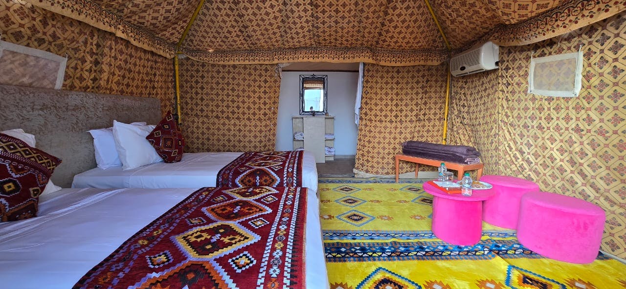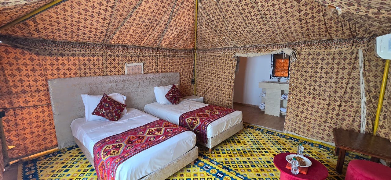 Royal Suite with Queen Bed - MERZANE For your premium Morocco desert stay, the Royale Suite Merzane with Erg Chebbi dunes view offers a majestic bedroom with a sumptuous king-size bed, a private lounge area for relaxation, and an elegant en-suite bathroom. Thoughtfully designed with authentic Berber accents and premium amenities, the Royal Suite ensures an unforgettable stay. Wake up to breathtaking, panoramic views of the golden Erg Chebbi dunes right from your doorstep, blending unparalleled comfort with the raw beauty of the Sahara.It features a hot tub and a pool with a view, offering a truly unique experience.Fully air-conditioned, it includes a private bathroom with a bathtub and bidet. The suite is also equipped with a minibar, tea and coffee maker, soundproof walls, and a terrace overlooking the garden.Royal Suite with King-Size Bed & Spa Bath - RISSANI Royal Suite “Rissani” – Luxury Desert Suite in Merzouga | Private Jacuzzi & Premium Comfort : Experience one of the finest luxury suites in the Moroccan desert.The Royal Suite “Rissani” at Yakout Merzouga Luxury Camp offers an exceptional stay in the heart of the Erg Chebbi dunes, blending modern elegance, Berber craftsmanship, and absolute comfort.Designed for discerning travelers, this spacious suite features a high-comfort King Size bed, a private jacuzzi, and a premium bathroom equipped with a bidet, soft atmospheric lighting, and refined finishes.The living area includes a cozy lounge corner with two armchairs and a stylish table—perfect for relaxing or enjoying traditional Moroccan tea. A refined work desk is also available for guests who need a calm and inspiring environment.The interior design harmoniously combines natural materials, Berber touches, and contemporary lines, creating a warm, authentic, and luxurious atmosphere. Ideal for couples, families, and honeymoon stays in Merzouga.Royal Suite with Spa Bath - BOUYA This suite features a hot tub and a pool with a view, offering guests a truly unique experience.Fully air-conditioned, it includes a private entrance, a comfortable living area, a separate bedroom, and a bathroom with a bathtub and bidet.The suite is also equipped with a minibar, tea and coffee maker, soundproof walls, and a patio with beautiful garden views.Royal Suite with Spa Bath - TAFILALET This suite features a hot tub and a pool with a view, offering a truly unique experience.Fully air-conditioned, it includes a private entrance, a living room, a separate bedroom, and a bathroom with a bathtub and bidet.The suite is also equipped with a minibar, tea and coffee maker, soundproof walls, and a terrace overlooking the garden.Royal Superior Suite - YAKOUT This suite offers a truly unique experience with its hot tub and pool with a view.Fully air-conditioned, it includes a private entrance, a comfortable living room, a separate bedroom, and a bathroom with a bathtub and bidet. The suite also features a minibar, tea and coffee maker, soundproof walls, and a terrace overlooking the garden — the perfect setting to relax and enjoy the tranquility of the desert.Royal Family Suite - SUNRISE Sunrise Royale Family Suite : A Magical Sunrise Awaits from Your Private Terrace .Overlooking the golden dunes of Merzouga, the Sunrise Royal Family Suite is the signature accommodation of Yakout Merzouga Luxury Camp. Designed to offer space, comfort, and privacy, this exclusive suite features two separate bedrooms, ideal for families and travelers seeking a luxurious stay in the heart of the Sahara Desert.The suite includes a private bathroom with a hot shower, toilet, and complimentary toiletries. A sofa provides a comfortable seating area to relax after a day exploring the dunes. The highlight of the Sunrise Suite is its very large private terrace, offering stunning panoramic views of the Erg Chebbi dunes—perfect for enjoying the iconic desert sunrises that inspired the suite’s name. Combining elegance, modern comfort, and full desert immersion, the Sunrise Royal Family Suite is the perfect choice for families seeking a spacious, high-end accommodation with direct access to Merzouga’s most iconic landscapes and an unforgettable Saharan experience.Deluxe Tent Yakout Merzouga Luxury Camp - Deluxe Tent Experience in the Heart of Erg Chebbi : Located in the heart of the Merzouga dunes, near the famous Erg Chebbi, the Yakout Merzouga Luxury Camp offers Deluxe Tents that combine modern comfort with an authentic Sahara experience. Spacious and elegantly decorated with natural materials, each tent features a premium bed, a cozy seating area, and a private terrace where guests can enjoy the stunning desert sunrise and sunset. Each Deluxe Tent includes a private bathroom, hot shower, complimentary toiletries, and an efficient heating system for the cool desert nights. Designed for peace, comfort, and privacy, the tent provides a relaxing atmosphere and a true immersion in the unique landscapes of the Sahara. Ideal for couples, families, and travelers seeking a genuine desert experience, the Deluxe Tent offers direct access to Merzouga’s iconic dunes and serves as the perfect luxury accommodation to explore the Sahara in complete serenity.Superior Tent All the Superior Tents are currently under renovation.